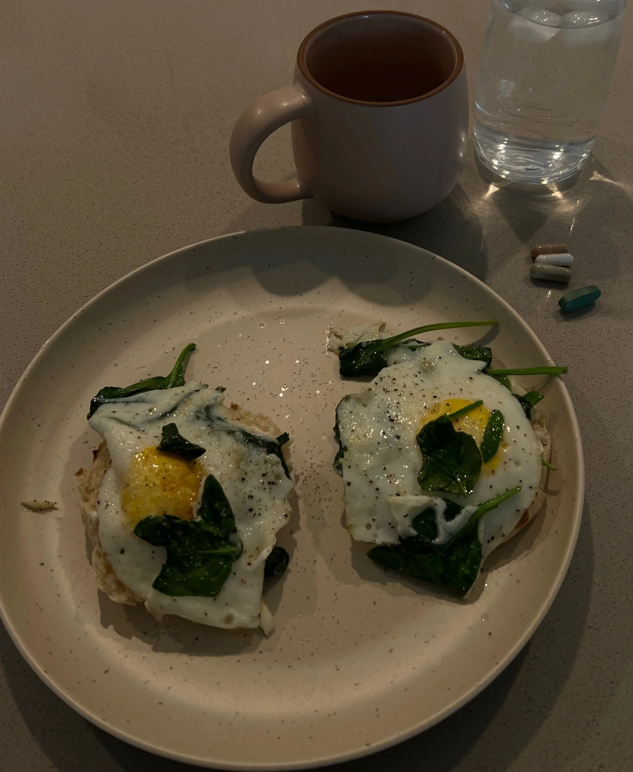 -Crack two eggs into a pan and top with spinach